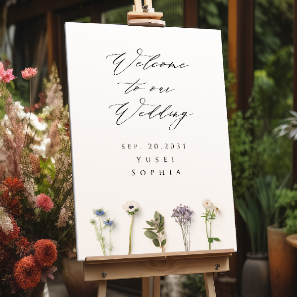 複数の花が組み合わせられ、クールで上品さが溢れるウェルカムボードです。落ち着いていて安らぎのある空間でゲストをおもてなし。ナチュラル・ガーデンウェディングにおすすめです。