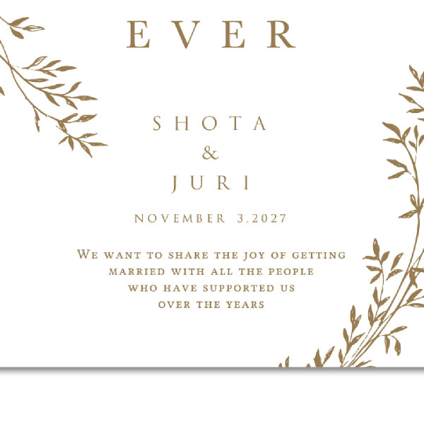草花をモチーフにしたデザインで、上品さの中にナチュラルな印象をプラス。シャンス(CHANCE)はフランス語で「幸運」の名前をもつエレガントで繊細な一枚。シンプルで上質なデザインは、落ち着いたおふたりにぴったりです。