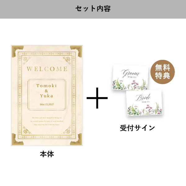 | 無料特典 | 受付サイン1組(新郎用×1組、新婦用×1組) |
