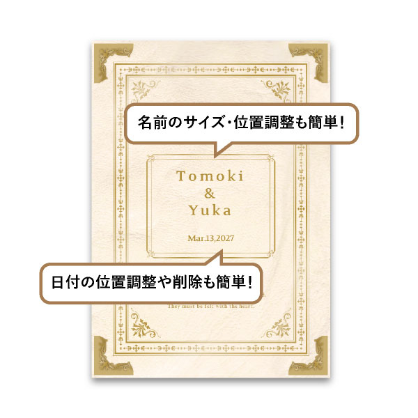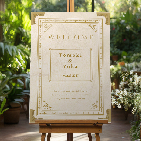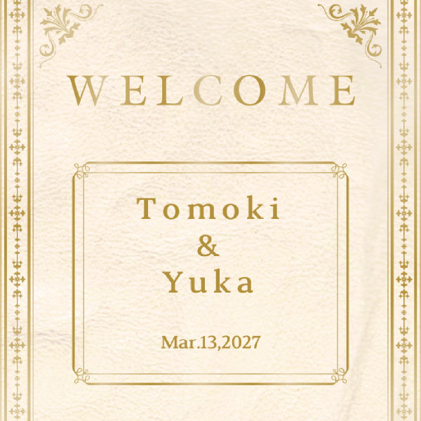 アイボリーをベースとしたアンティーク調の洋書風のデザイン。おふたりの物語が始まるようなワクワク感があるユニークな一枚です。高級感のあるデザインは、ホテルやチャペルウェディングにぴったりです。