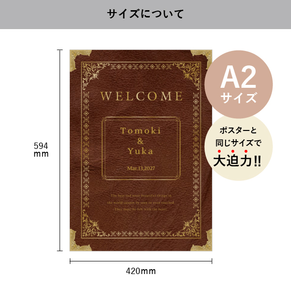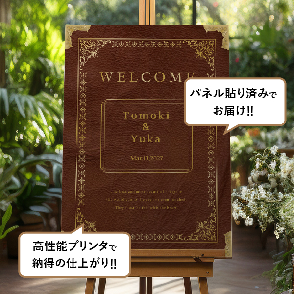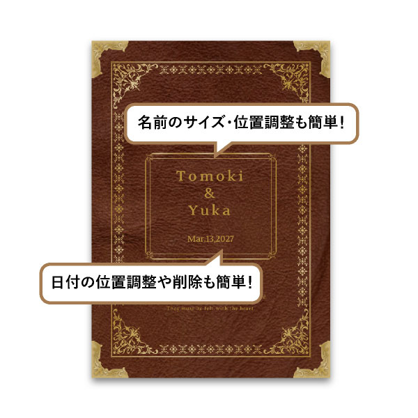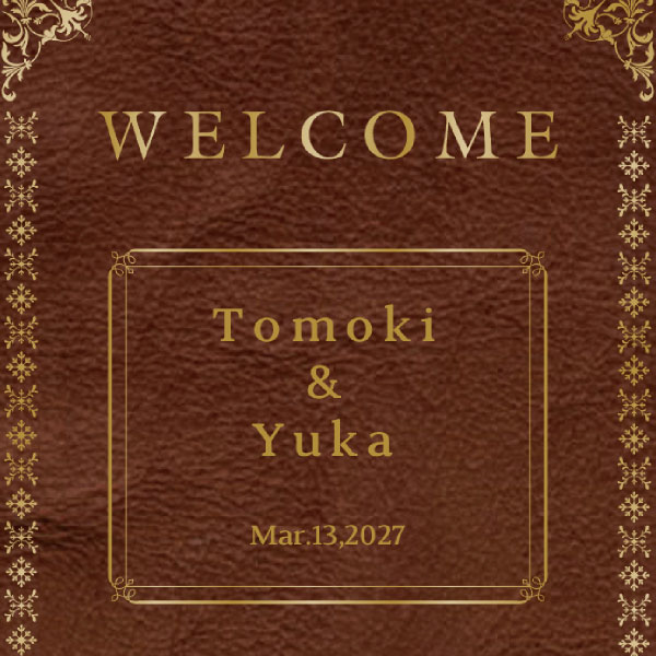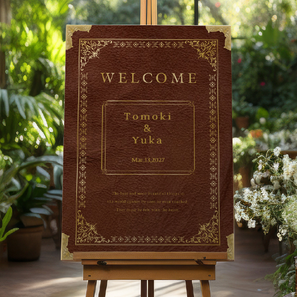ブラウンをベースとしたアンティーク調の洋書風のデザイン。おふたりの物語が始まるようなワクワク感があるユニークな一枚です。上品で高級感のあるデザインは、素敵な空間を演出してくれます。