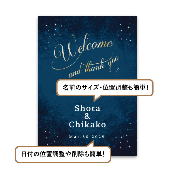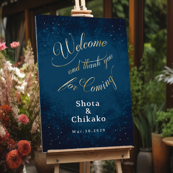 満天の夜空にちりばめたスターをゲストへお届け。ナイトウェディングをよりロマンチックに演出してくれます。ちりばめられた星がおふたりの未来を輝かせてくれるような、素敵なウェルカムボードです。