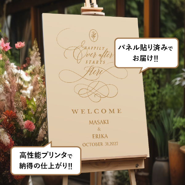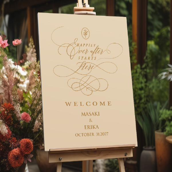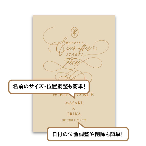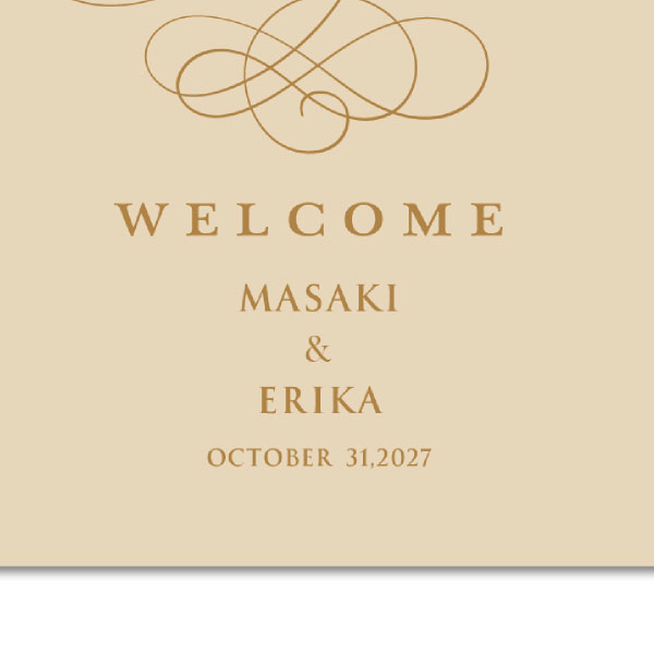 上質で品のあるシックでシンプルなカリグラフィーデザイン。気品を感じさせるワンランク上のウェディングスタイルに。ベージュカラーで、高級感がありながらも自然な印象にしてくれます。