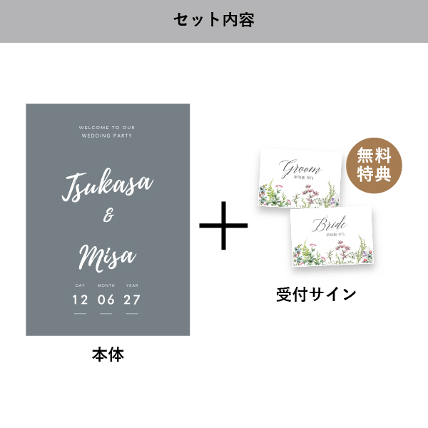 | 無料特典 | 受付サイン1組(新郎用×1組、新婦用×1組) |