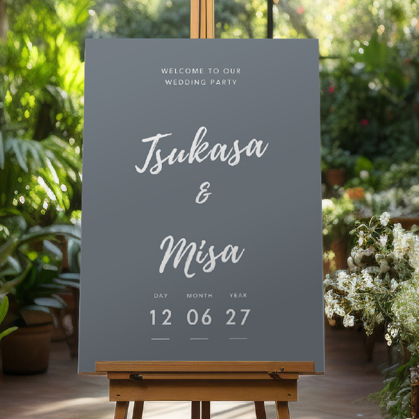 落ち着いたくすみグレーがおしゃれなウェルカムボード。おしゃれなおふたりにぴったりな一枚です!おふたりの晴れの日をモダンに演出してくれます。