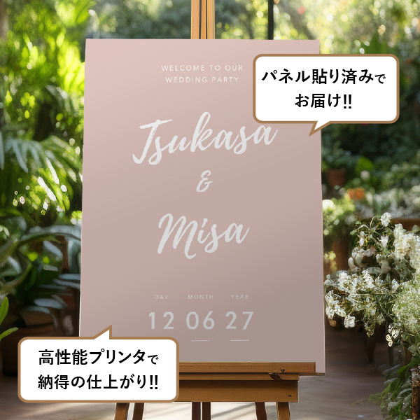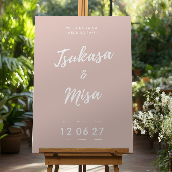 くすみ系のピンクベージュがおしゃれなウェルカムボード。カジュアル・ナチュラルウェディングなど様々なシーンにマッチするデザインです。おふたりの晴れの日をモダンに演出してくれます。