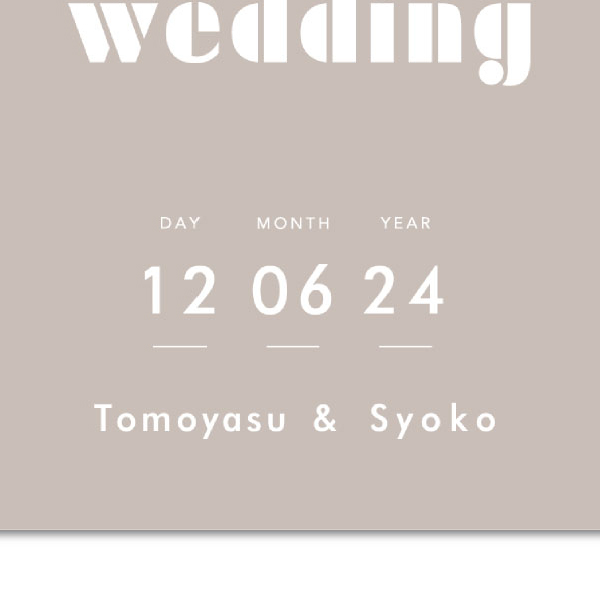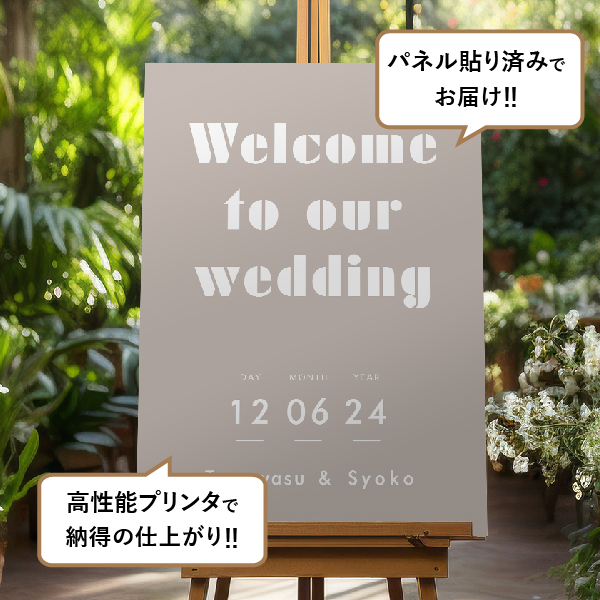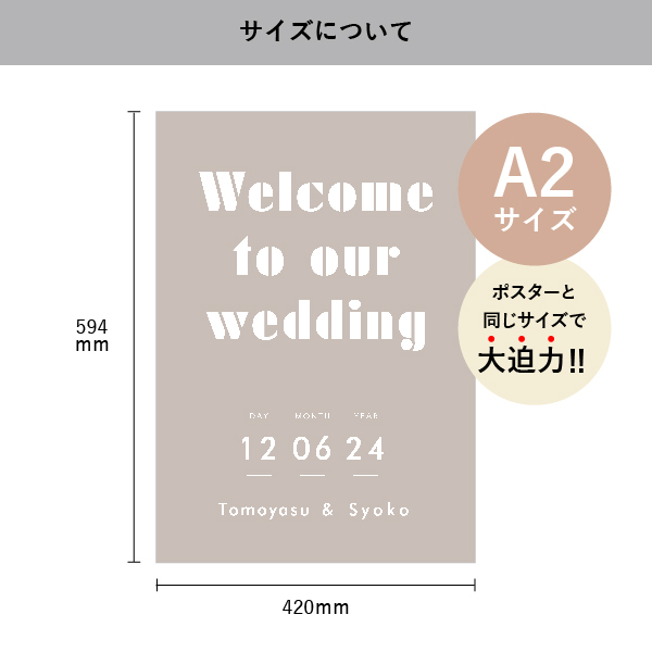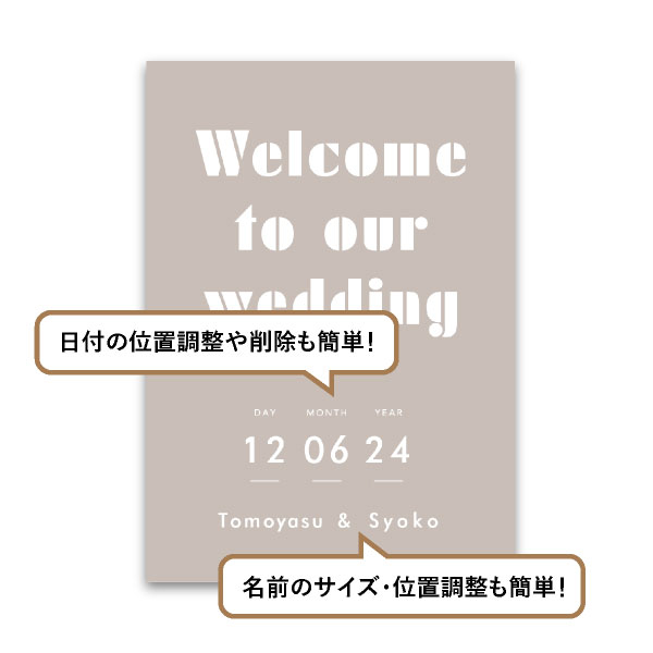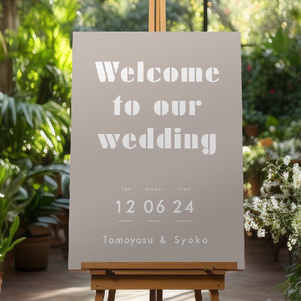 落ち着いたグレージュとポップな文字がウェルカムスペースをおしゃれにしてくれます。おふたりの晴れの日を可愛く演出します。カジュアル・ナチュラルなど様々なシーンにマッチするデザインです。