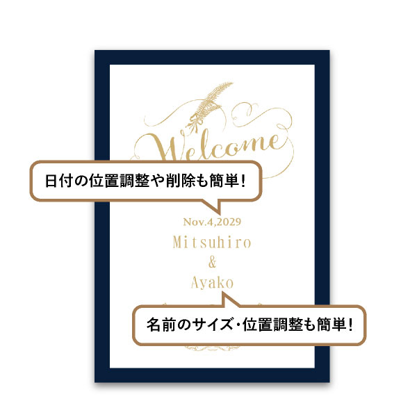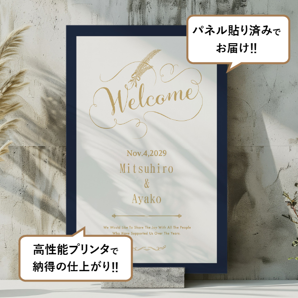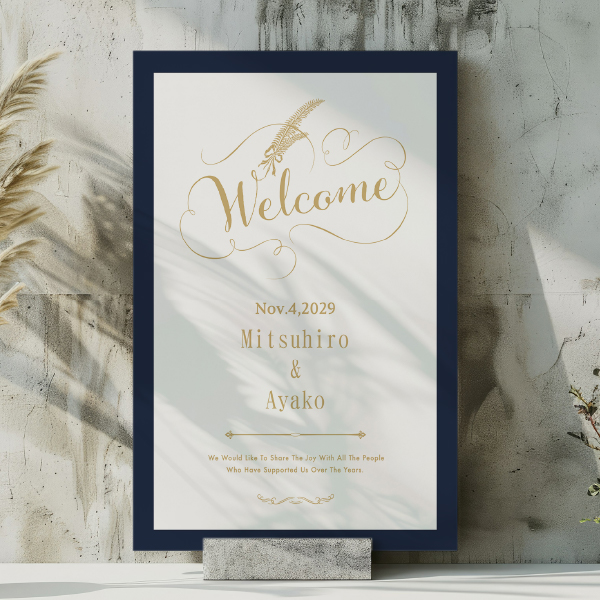 気品と温もりを感じさせるネイビー×ホワイトのデザイン。ゴールド系のカリグラフィーの文字が繊細な存在感のある上質なウェルカムボードです。クラシカル・エレガントウェディングにおすすめです。