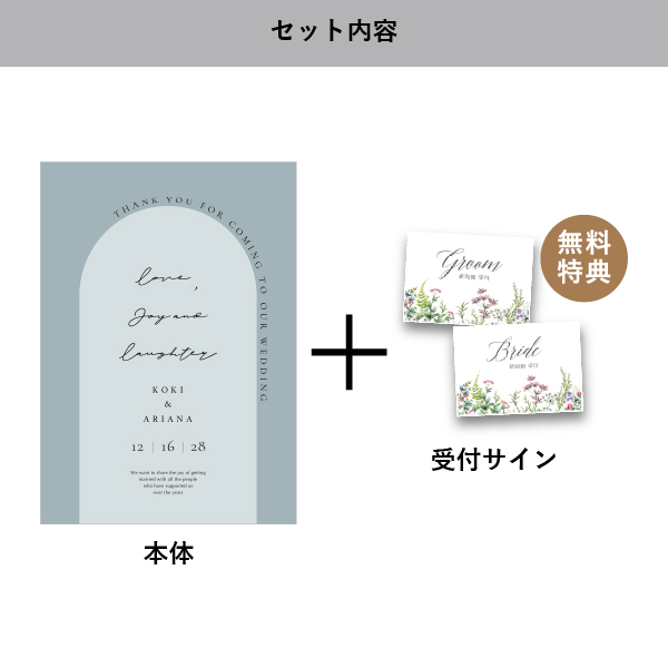 | 無料特典 | 受付サイン1組(新郎用×1組、新婦用×1組) |