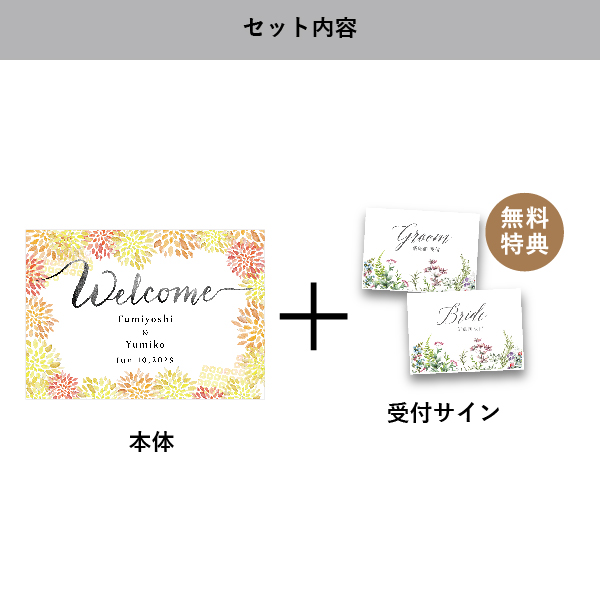| 無料特典 | 受付サイン1組(新郎用×1組、新婦用×1組) |