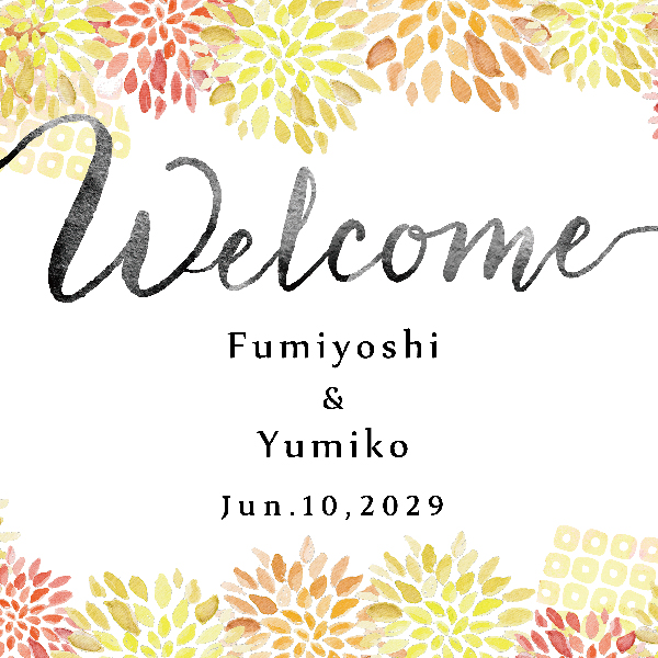 華麗なダリアを上品にあしらった、華やかで可憐なウェルカムボード。和モダンテイストから洋風のウェディングにも合う繊細さと豪華さを兼ね備えた一枚。ウェルカムスペースを華やかに演出してくれます。