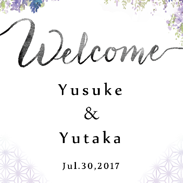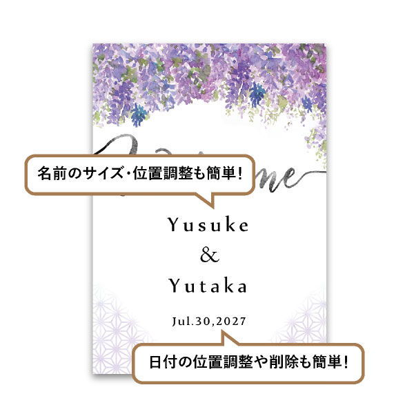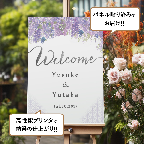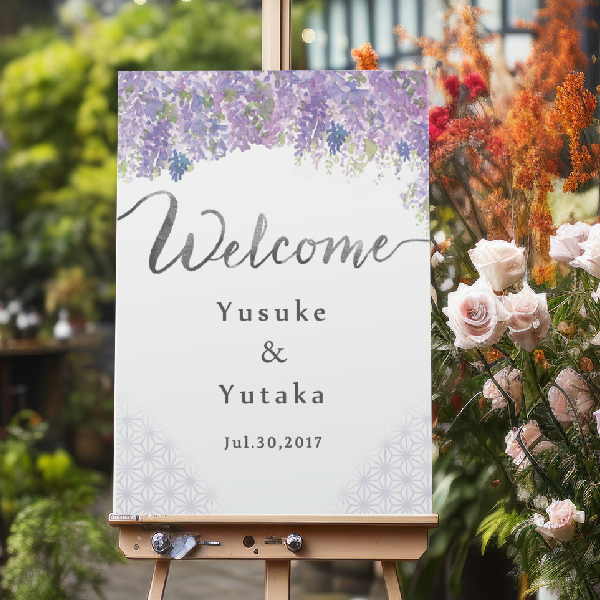 繊細で鮮やかな藤の花を上品にあしらった、落ち着いた色合いながらも華やかさのあるウェルカムボード。和モダンテイストから洋風のウェディングにも合う一枚です。華やかなウェルカムスペースでゲストをお迎えしましょう!