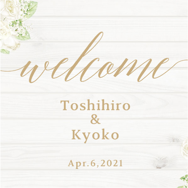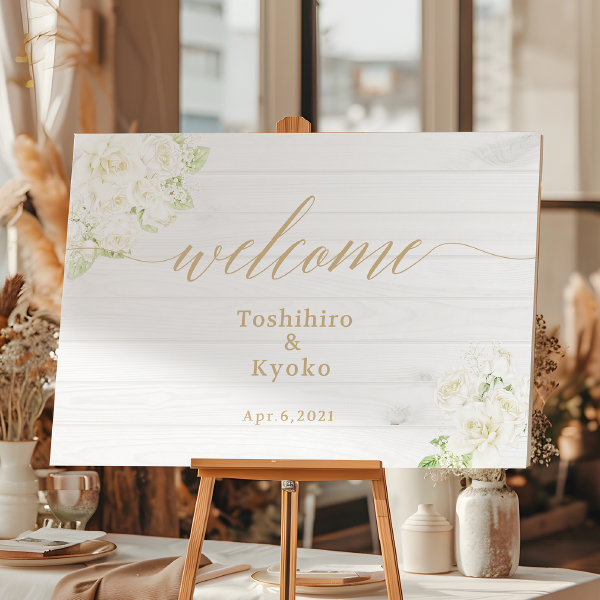 優しいホワイトローズと、かすみ草のブーケが愛らしい上品でエレガントなウェルカムボードです。背景の白木目調がナチュラルに演出してくれます。ナチュラル・ガーデンウェディングにおすすめです。