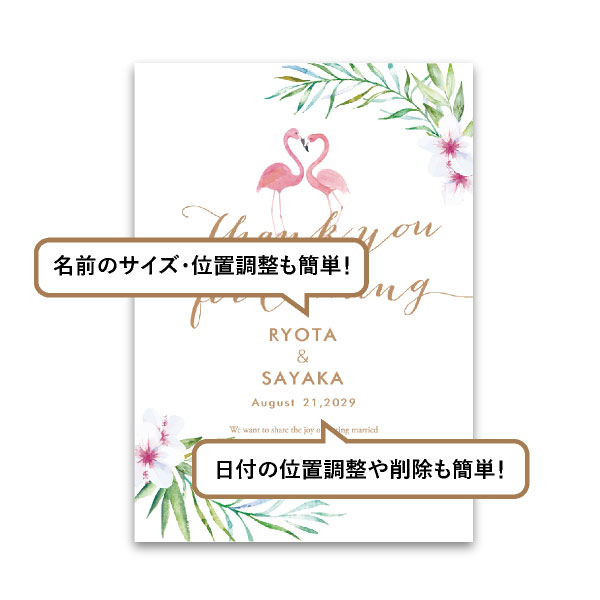 「幸運の鳥」フラミンゴをモチーフにしたリゾートテイストのリーフとフラワーがおしゃれなデザイン。大切な人たちにも幸運が訪れますように…幸せを願うフラミンゴカラーで、リラックスできる癒しの空間に♪