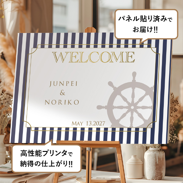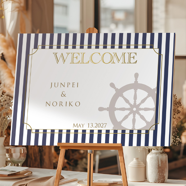 ブルー×ホワイトのストライプは、夏の青い海と白い砂浜を連想させます。爽やかな潮風と夏を感じるウェルカムボードです。どこかクラシカルな印象も持ち合わせているので、海沿いのホテルウェディングなどにもぴったり!