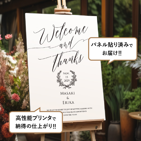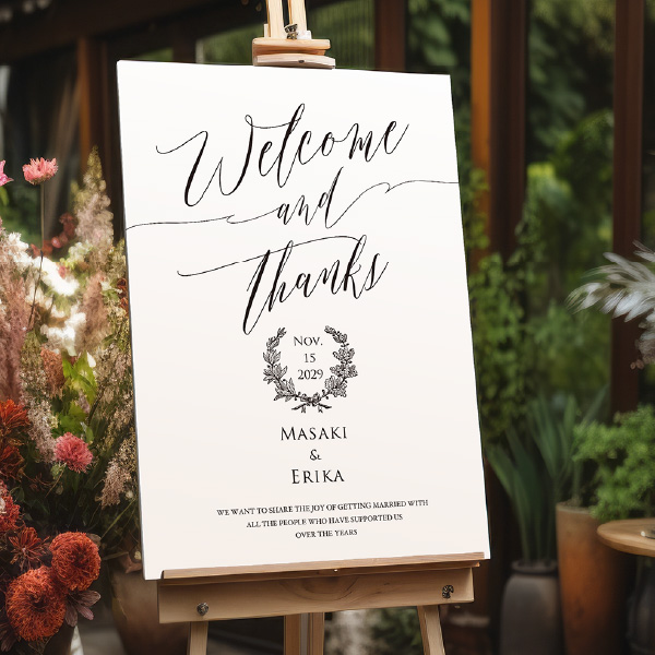 シンプルで無駄の無いどんなテーマにも合わせやすいナチュラルテイスト。落ち着きのあるデザインは大人な雰囲気も感じさせてくれます。「Welcome and Thanks」の文字がおしゃれなウェルカムボードで、ゲストをお迎えしましょう!