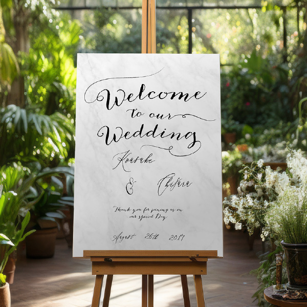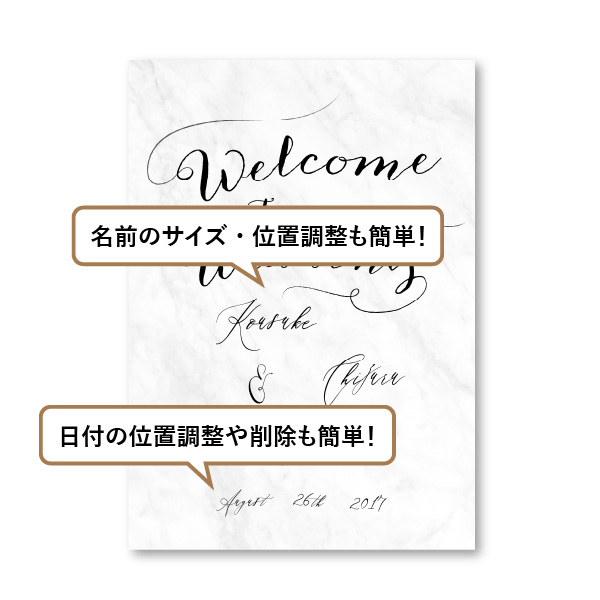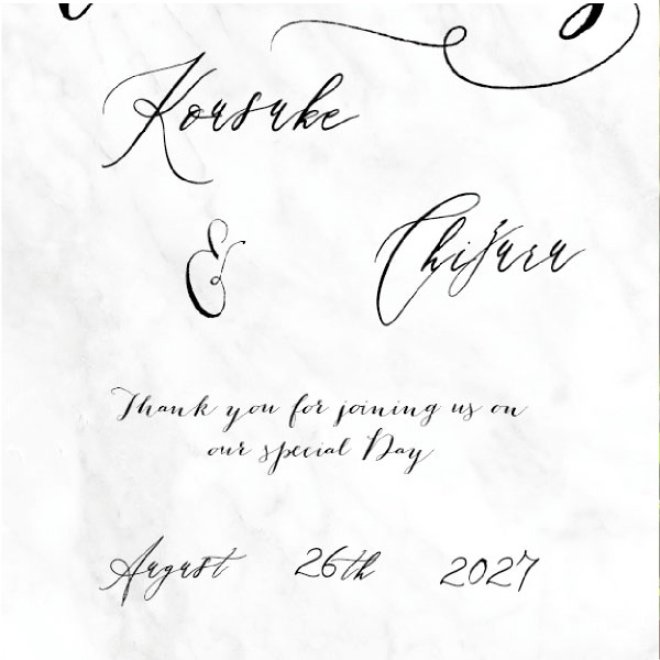 大理石のような上質なマーブルデザインは洗礼された重厚感あるウェディングに。文字のデザインもおしゃれで特徴的な一枚です。エレガント・クラシカルウェディングにおすすめです。