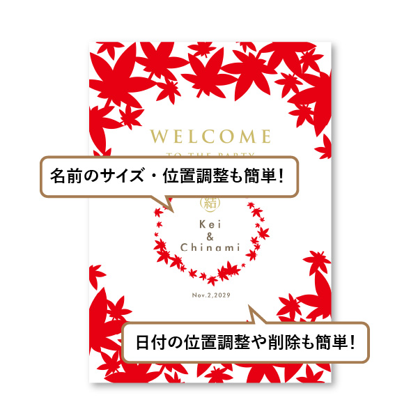 ひとひらひとひら重ね続けた喜びで鮮やかに染め上げた紅葉。秋晴れの和風ウェディングを上品に彩る一枚。大小さまざまな赤い紅葉が印象的なウェルカムボードで、ゲストをお迎えしましょう。