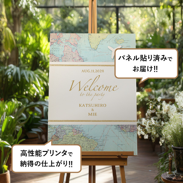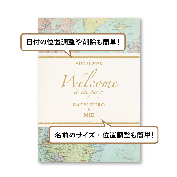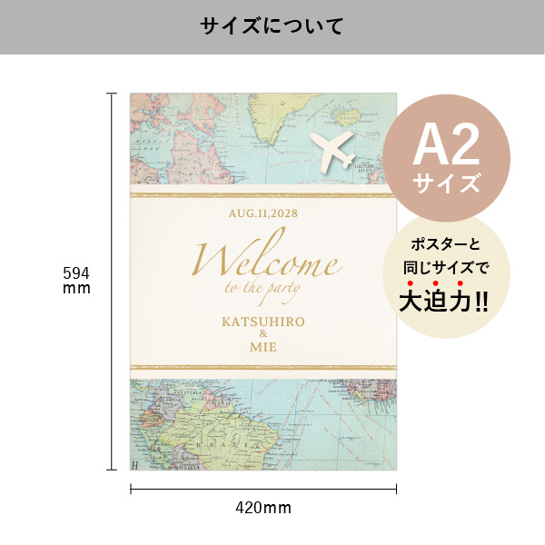 世界地図を全体的に広げた一枚。カジュアルの中にある大人っぽさが際立つ、旅行が大好きなおふたりはぴったりなデザインです。旅に出かけるような空間で、ゲストをお迎えしましょう!