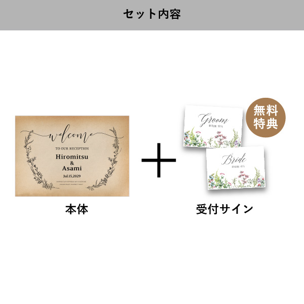| 無料特典 | 受付サイン1組(新郎用×1組、新婦用×1組) |