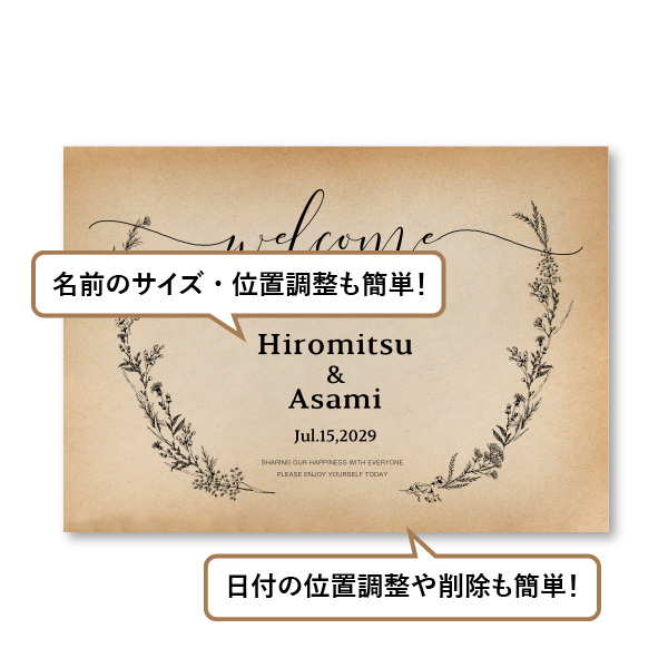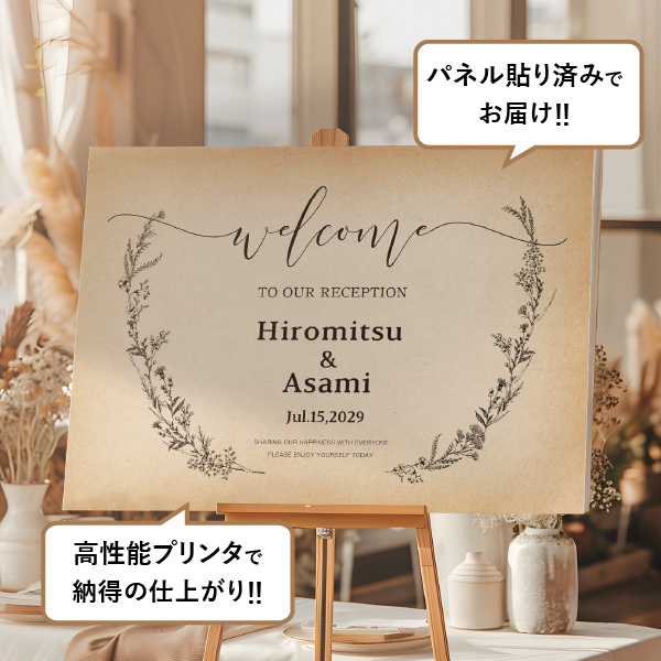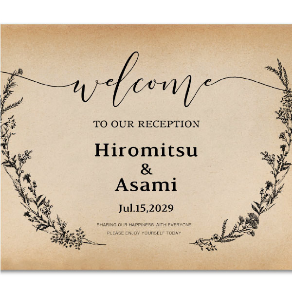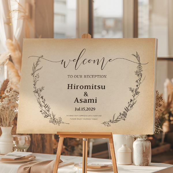 素朴でナチュラルな草花をモチーフに、飾らないおふたりらしさを詰め込んだウェルカムボード。ラスティックな雰囲気のデザインは落ち着いた印象でゲストさまをお迎えします。ナチュラル・カジュアル・ガーデンウェディングにおすすめです!