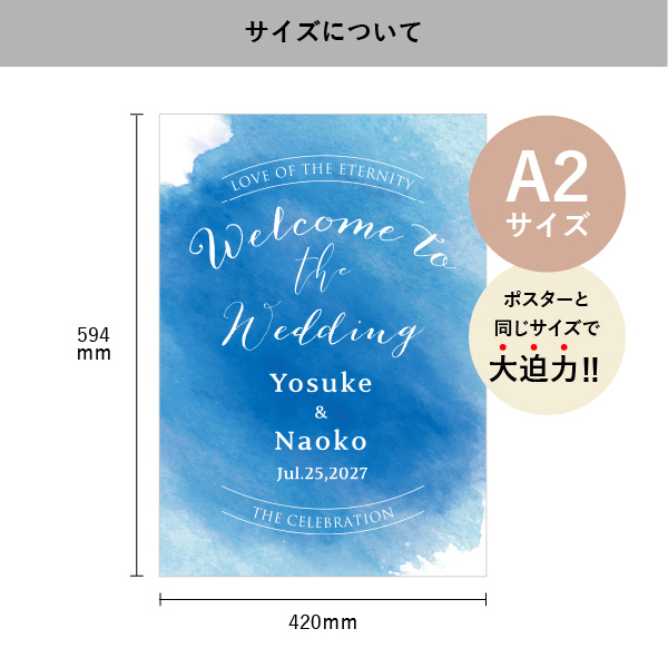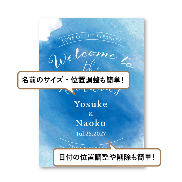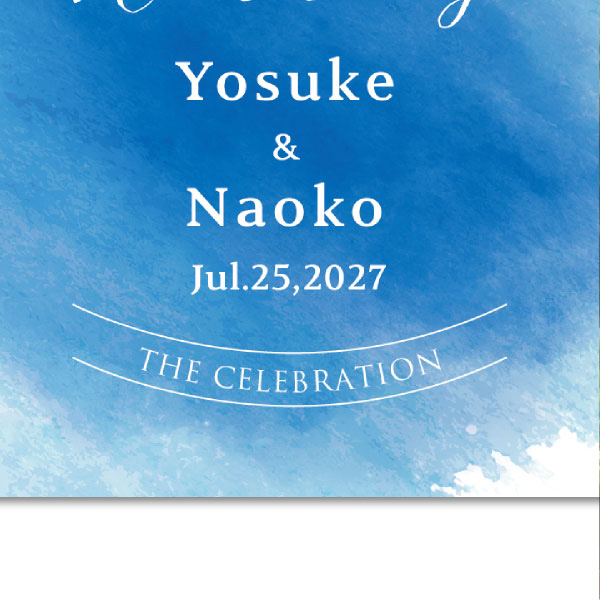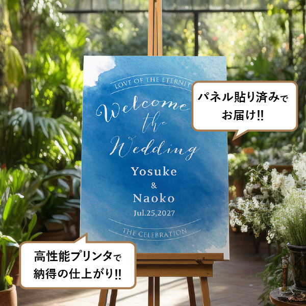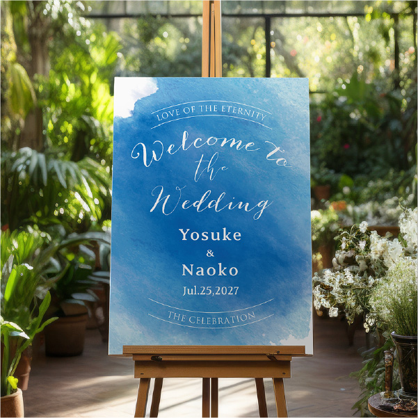 水彩で描いた鮮やかなブルー。海にも空にも見えるデザインからは、リバティー(自由)を感じ、ブルー×ホワイトのコントラストが清々しさを演出してくれる一枚。爽やかな印象のウェルカムボードは、リゾート・ガーデンウェディングにおすすめです。
