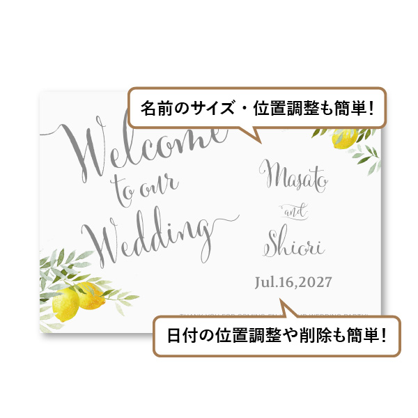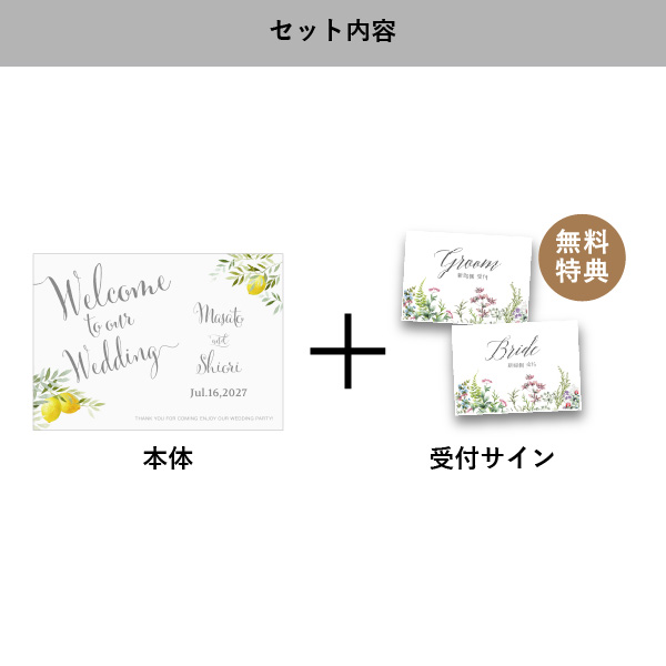 | 無料特典 | 受付サイン1組(新郎用×1組、新婦用×1組) |