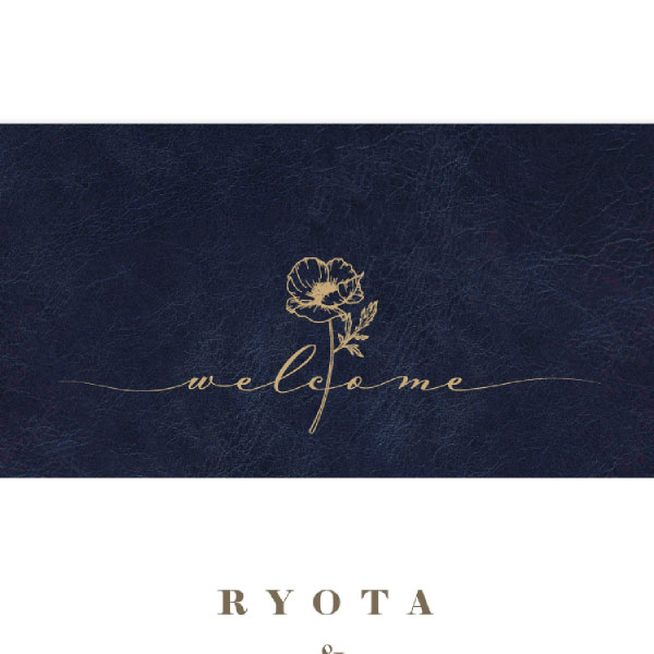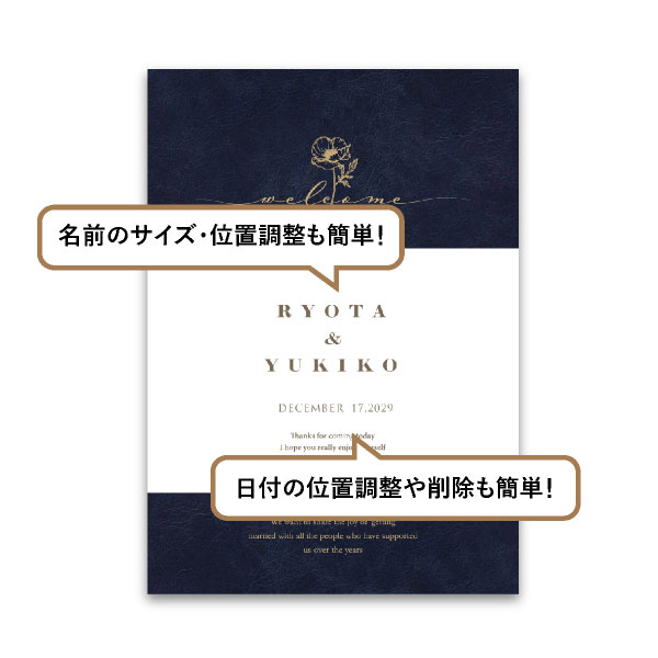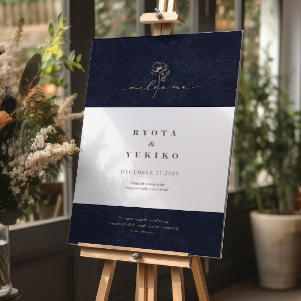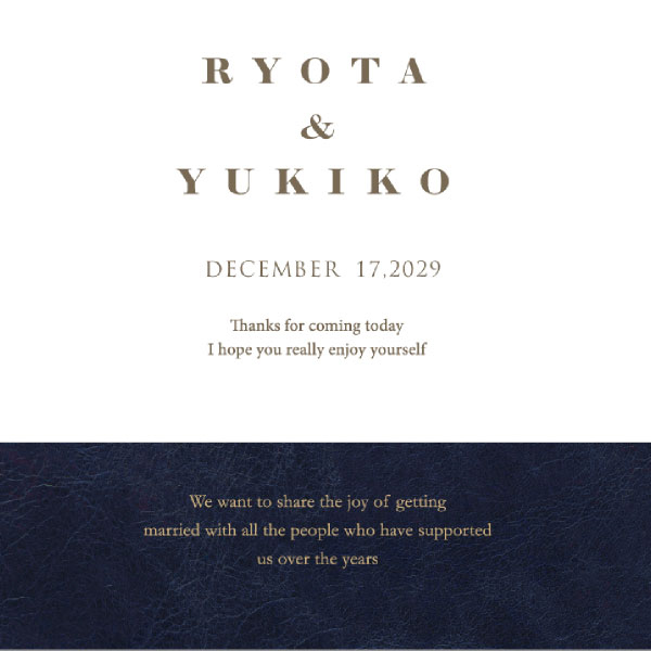 本物の革のような重厚なネイビーの背景に、自然をモチーフにした洗練された模様を施した格調高い雰囲気に。高級感のあるデザインは、ホテルウェディングやクラシカルスタイルにおすすめです!
