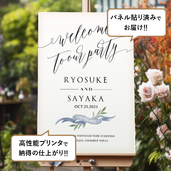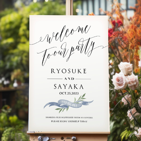 上品で凛としたブルーリボンが際立つウェルカムボード。澄んだ青空のようにおふたりの心に広がる清々しい想いをイメージしたデザイン。爽やかなデザインは、ナチュラル・ガーデンウェディングにおすすめです!