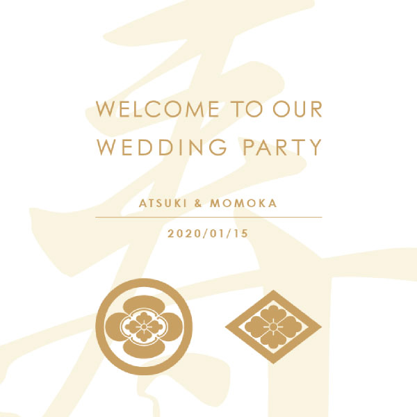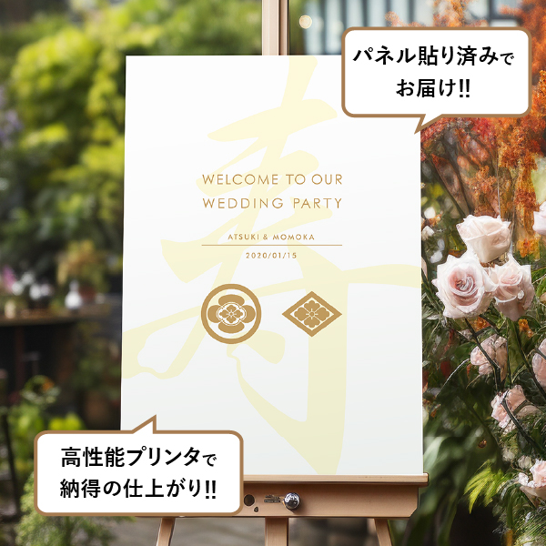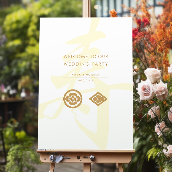 両家の家紋を使って作る世界に1つだけのウェルカムボード。落ち着いた雰囲気で和装の結婚式にピッタリです。ホワイトを基調としたデザインで、明るく華やかな印象に。
