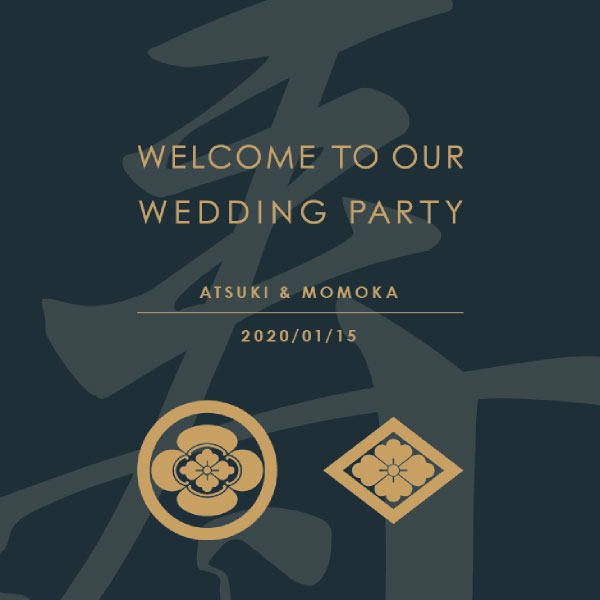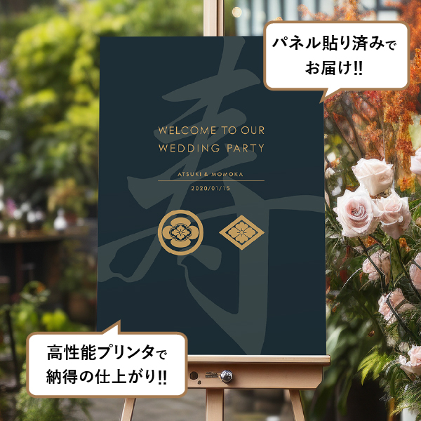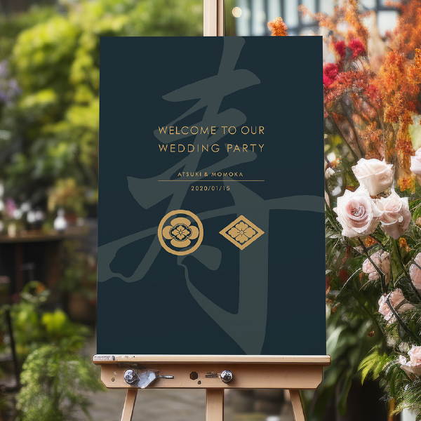 両家の家紋を使って作る世界に1つだけのウェルカムボード。落ち着いた雰囲気で和装の結婚式にピッタリです。碧色を基調としたデザインで、重厚感のある印象に。