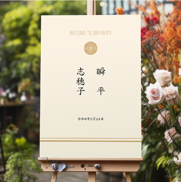 良い兆しという意味を持つ「吉祥文様」をモチーフにした伝統的でモダンな粋なデザインのウェルカムボード。格式高い和風ウェディングをより一層際立たせてくれるアイテムです。シンプルなデザインがおふたりの名前を引き立ててくれます。