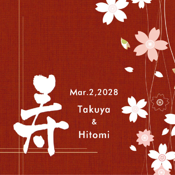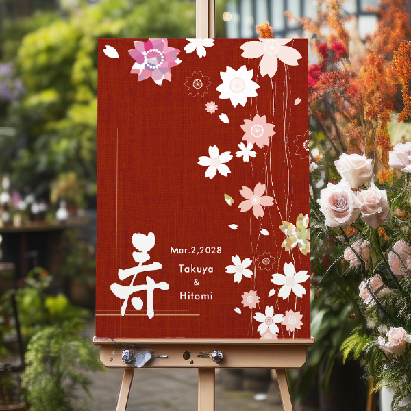 さまざまな色や形の花々がとても素敵なウェルカムボードです。流れるような模様はまるで水流のよう。着物の柄のような繊細なデザインは、どの世代のゲストにも好印象間違いなし!「寿」の文字が映える、和ウェディングにおすすめのデザインです。