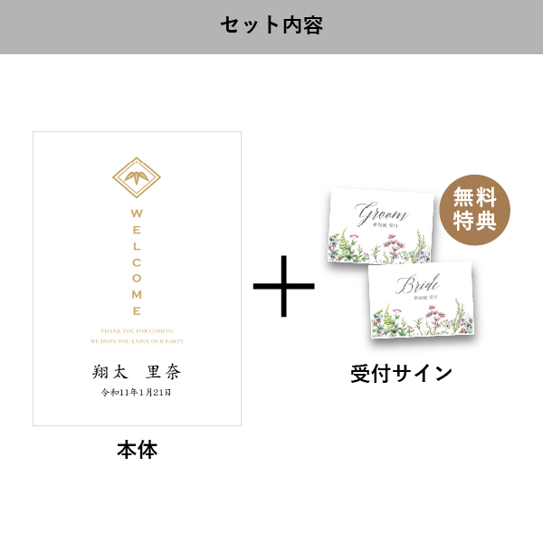 | 無料特典 | 受付サイン1組(新郎用×1組、新婦用×1組) |