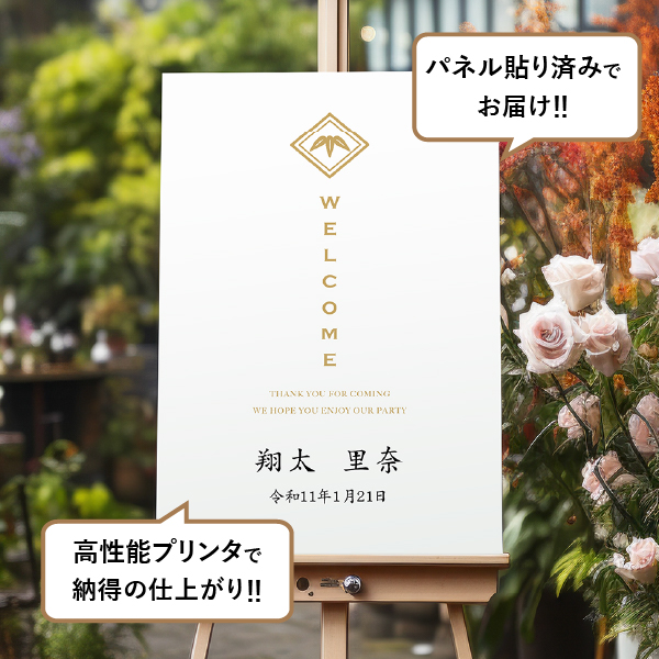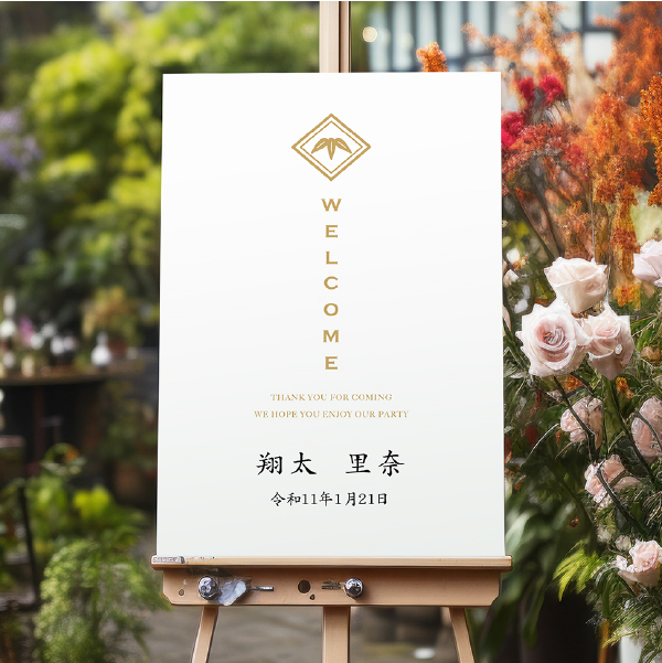 正統派和風スタイルは、シンプルながら上品な重厚感ある格式高い大人の和風ウェディングを演出します。すっきりとしたデザインは、おふたりの名前を際立たせてくれます。ゴールドの英字がおしゃれなウェルカムボードです。