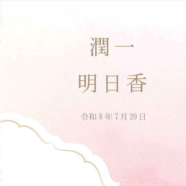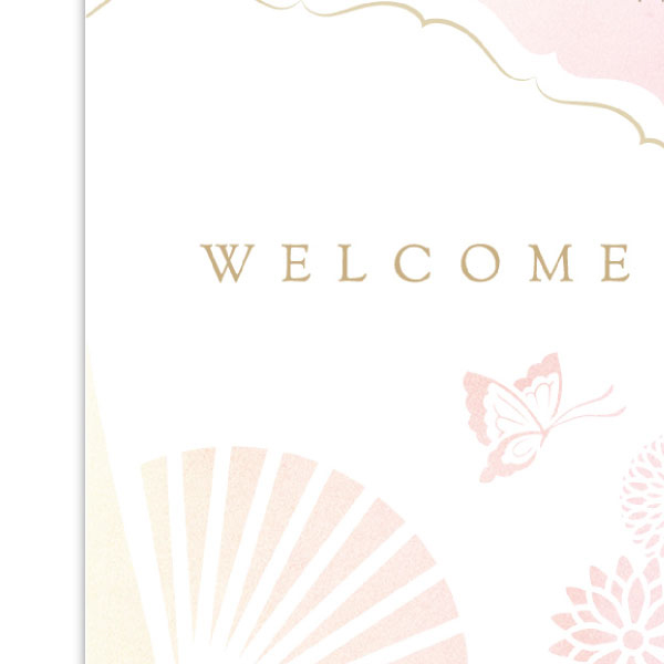 上品な扇子の中に蝶が舞う繊細で美しい絵画のような一枚。水彩タッチのピンクを基調とした、優しくあたたかみのあるデザイン。正統派にも和モダンウェディングにもおすすめです。