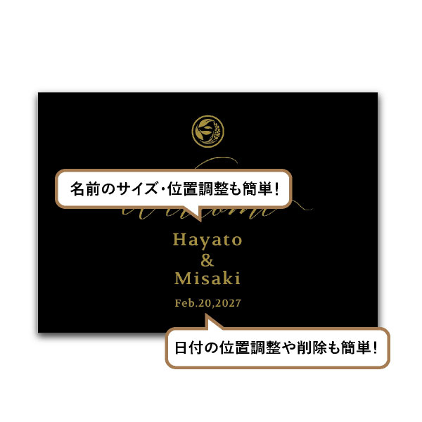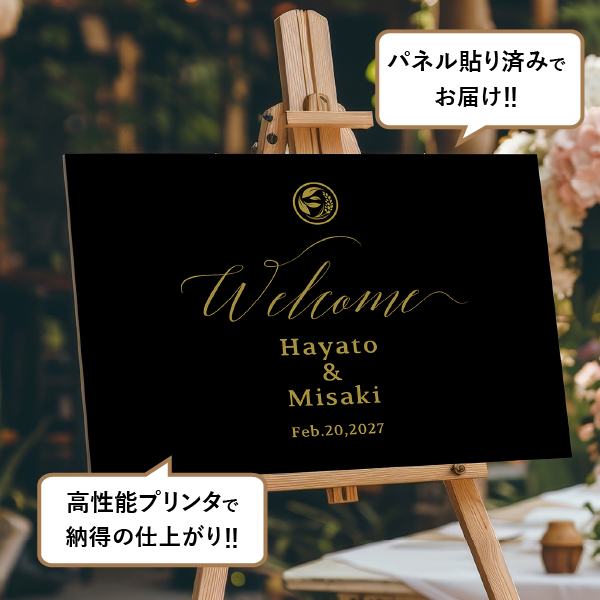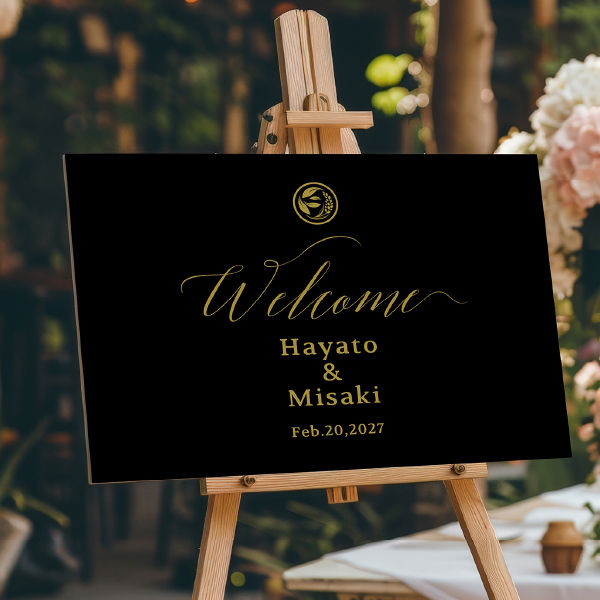 モダンでシンプルな黒いベースデザイン、上質な雰囲気が重厚感を生み出してくれるウェルカムボード。ブラックにゴールドの文字が高級感溢れるデザインで、洗練された和モダンな空間を演出してくれます。