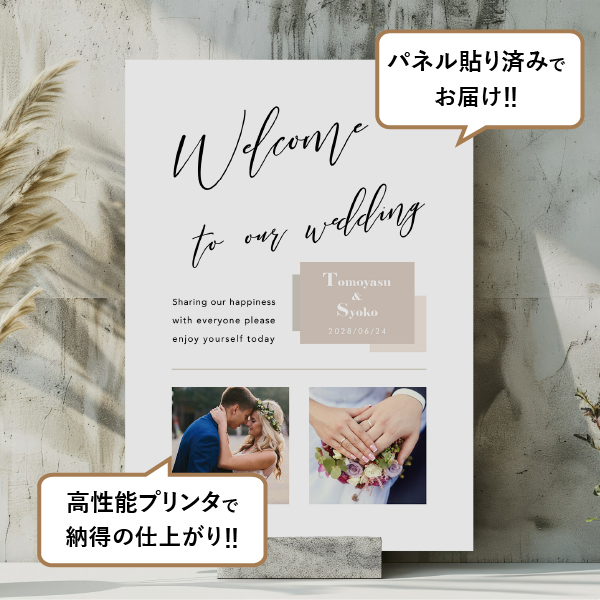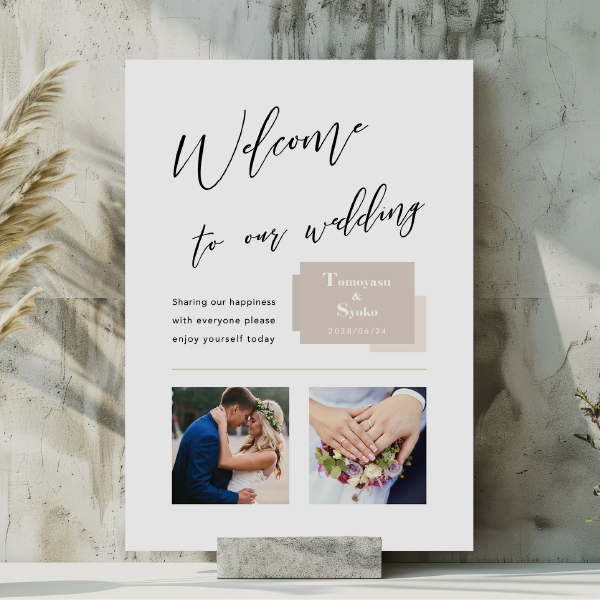 ベージュカラーを基調としたシンプルでおしゃれなウェルカムボード。おふたりのお気に入りの写真やペットの写真を入れたり、幅広く使えます。ナチュラルウェディングやカジュアルウェディングにおすすめです。