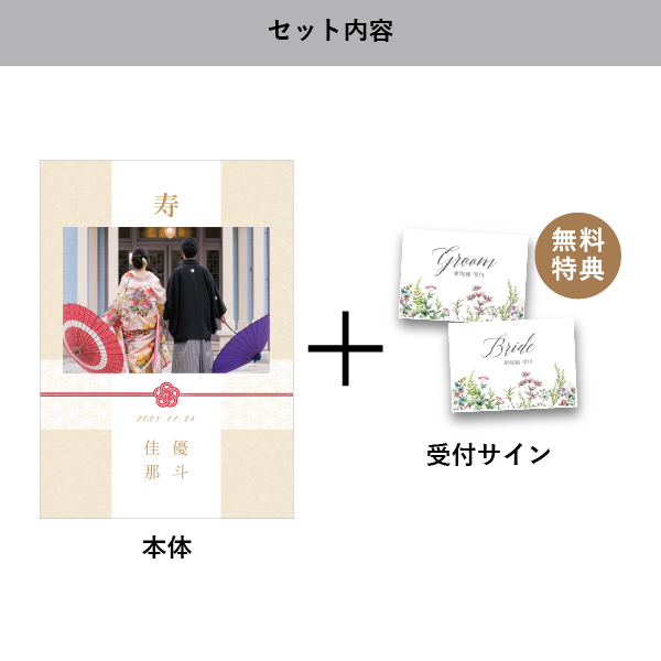 | 無料特典 | 受付サイン1組(新郎用×1組、新婦用×1組) |
