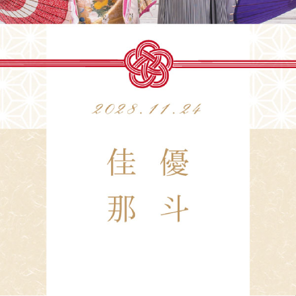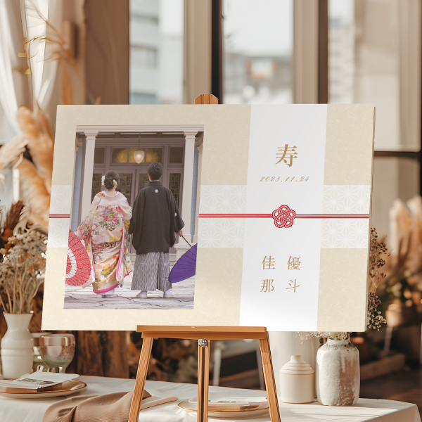 和装ウェディングにぴったりな色合いとはんなりとして雰囲気を兼ね備えたウェルカムボード。水引が可愛らしく花を咲かせています。イエローベージュを背景に和柄をあしらったデザインは、和モダンな印象にしてくれます。
