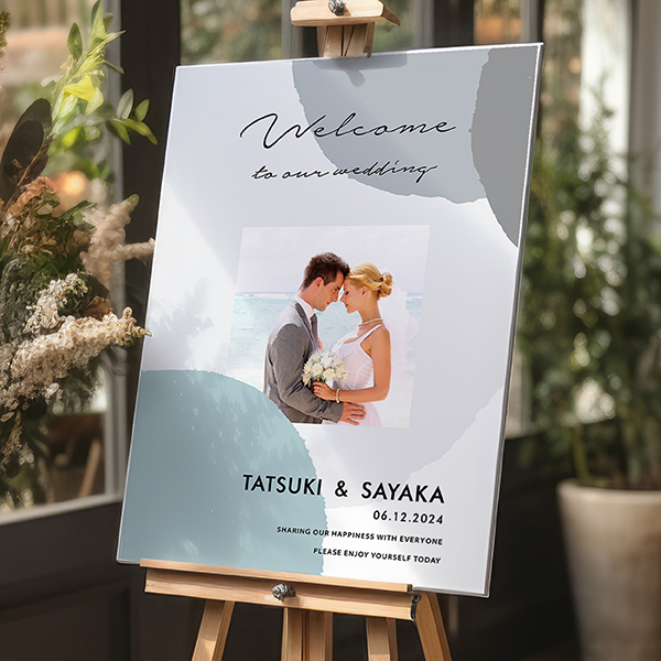 ブルー系のカモフラージュ柄がおしゃれなウェルカムボード。北欧デザインがお好きな方やナチュラル、カジュアルウェディングにぴったりです。4つのカラーバリエーションからお好きなデザインをお選びください。