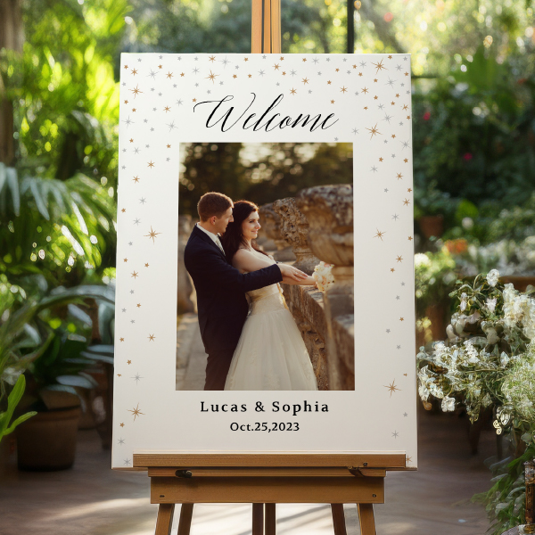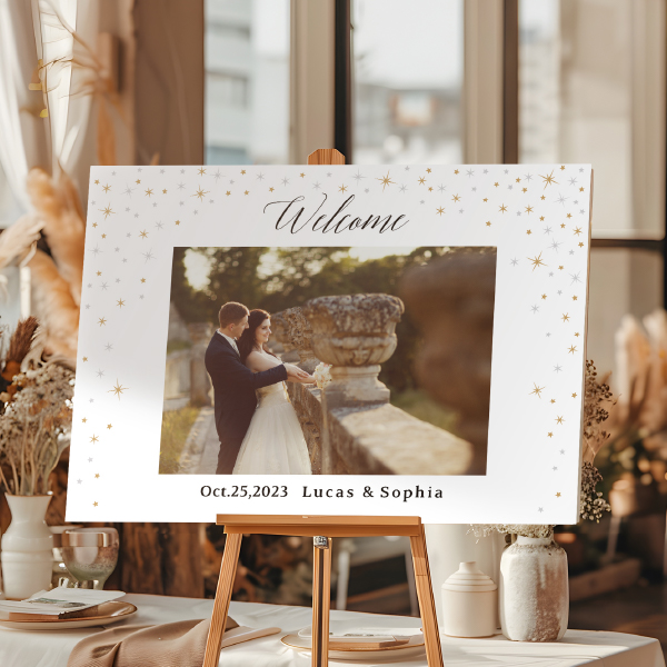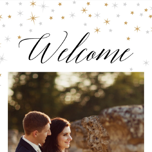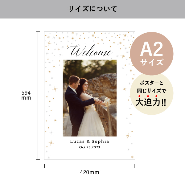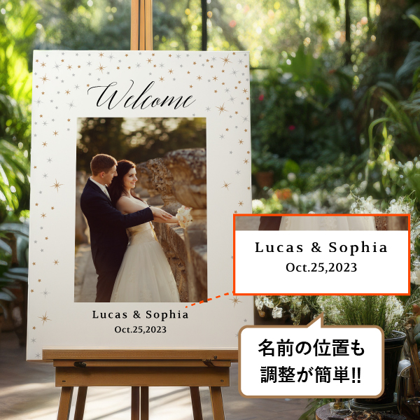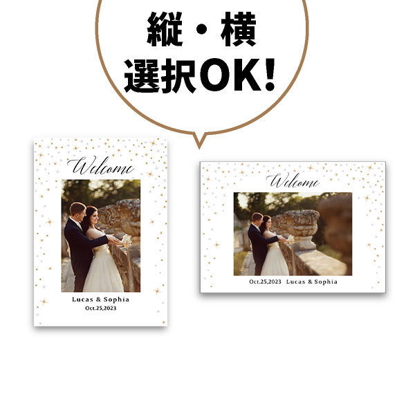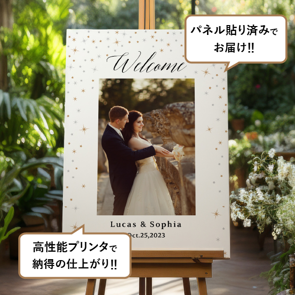 夜空の星のようにちりばめられたゴールドは、おふたりの大切な写真をより輝かしいものにしてくれます。ホテルやチャペルウェディングにオススメです。煌めく空間とおふたりの素敵な写真で、ゲストをお出迎えしましょう!