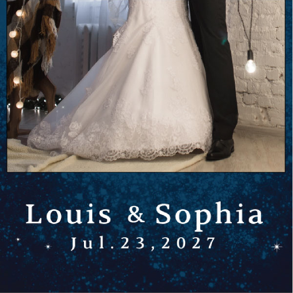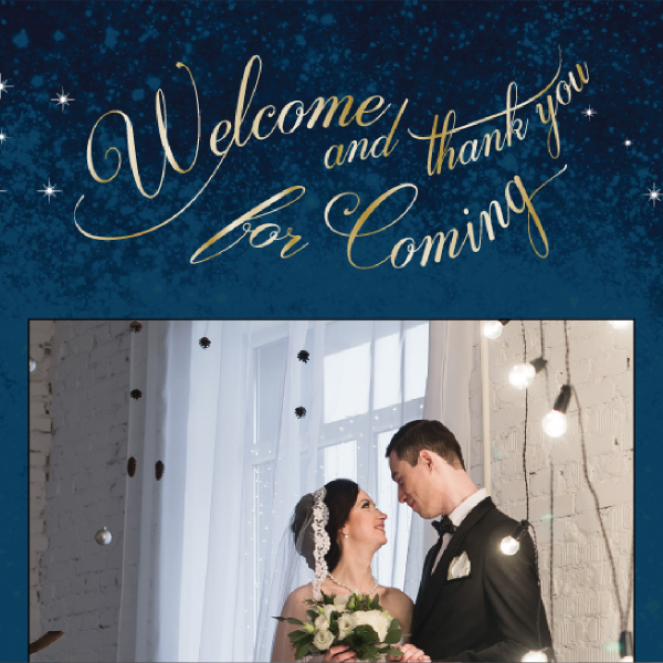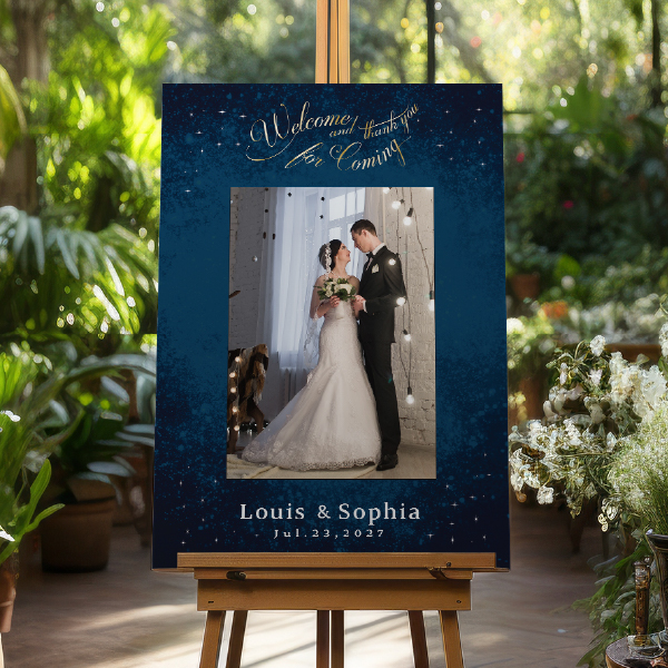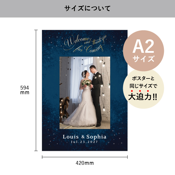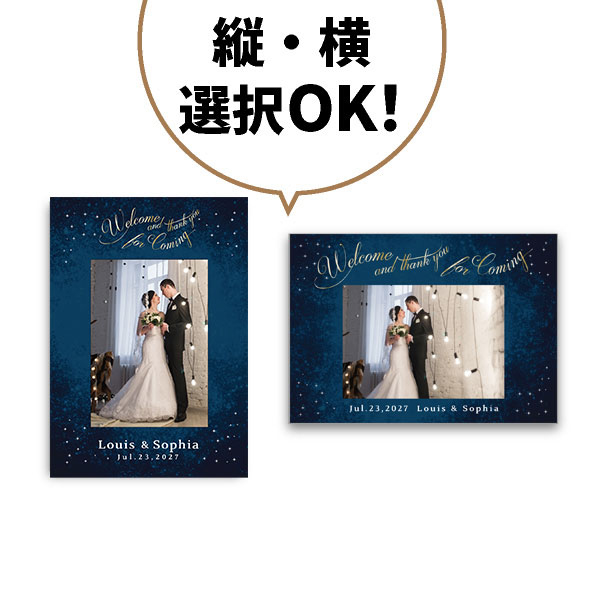 夜空に輝く星がロマンチックなデザインのウェルカムボード。おふたりの写真を夜の星の光で引き立てます。ウェルカムボードに大人気!おふたりの写真をメインにした、センスの光るデザインが目を惹くフォトウェルカムボードです。