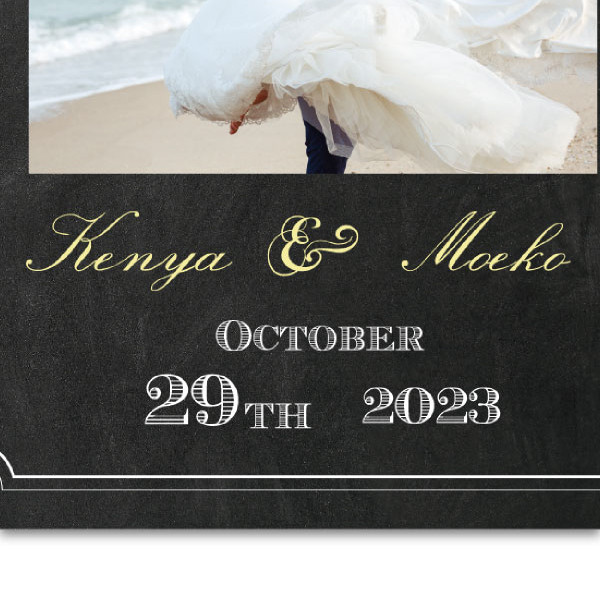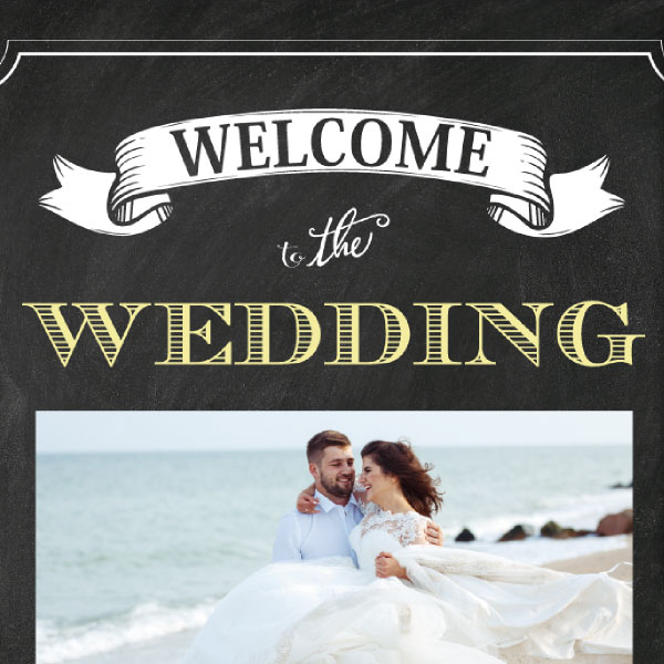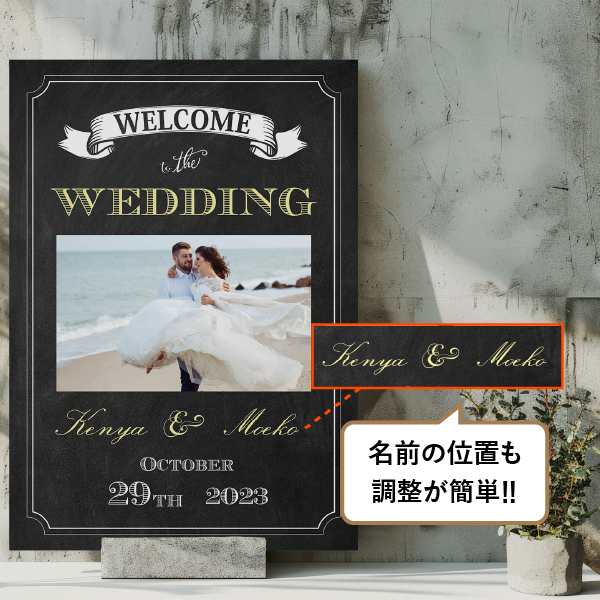 海外風ウェディングをイメージしたシックで高級感あふれるブラックボード風ウェルカムボード。おふたりの写真をよりスタイリッシュに見せてくれます。センスが光るデザインは、リゾートやカジュアルウェディングにおすすめです!
