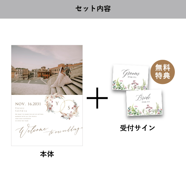 | 無料特典 | 受付サイン1組(新郎用×1組、新婦用×1組) |