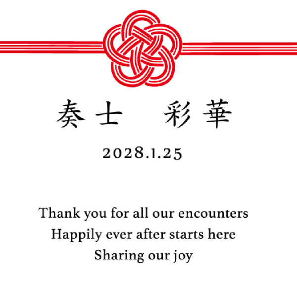 1年中どの季節の和ウェディングにもぴったりと合うシンプルかつ高級感あふれる正統派和風スタイル。中心にある水引はこれからもおふたりを結ぶために。和の中に英文を入れることで、こなれた雰囲気を出してくれます。