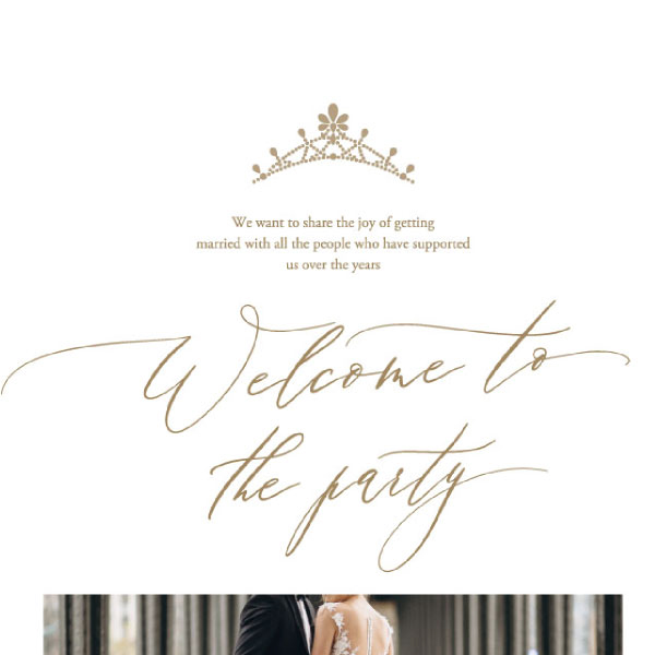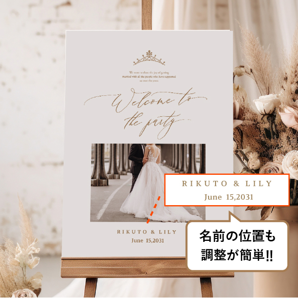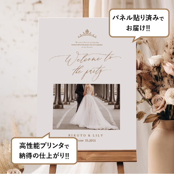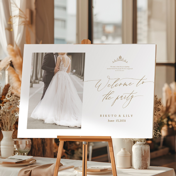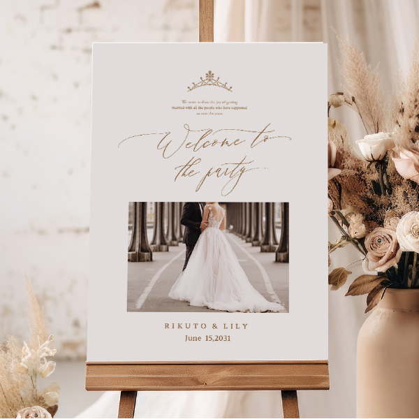 「光る、輝く、透き通った」を意味する「Lucent-ルーセント-」。花嫁の王道、ティアラをあしらったウェルカムボード。シンプルの中にも高級感、特別感のあふれるデザインで、どんな雰囲気のウェディングにも合わせやすいのが魅力的。