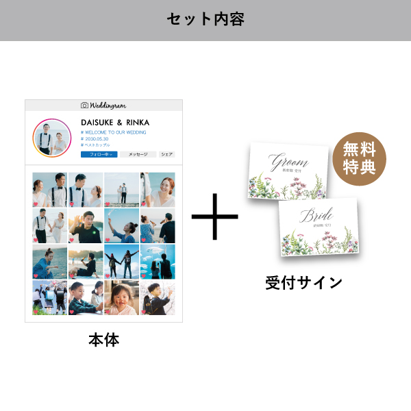 | 無料特典 | 受付サイン1組(新郎用×1組、新婦用×1組) |