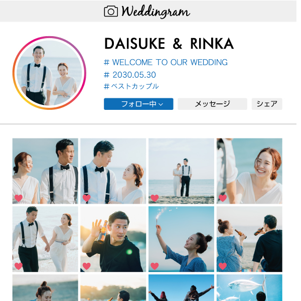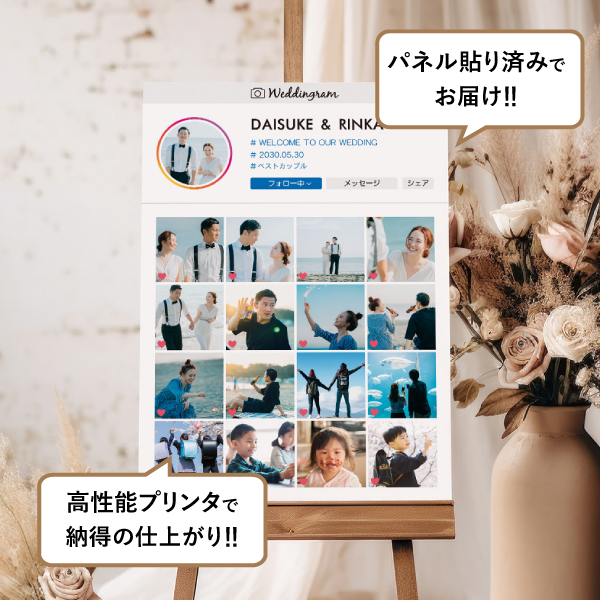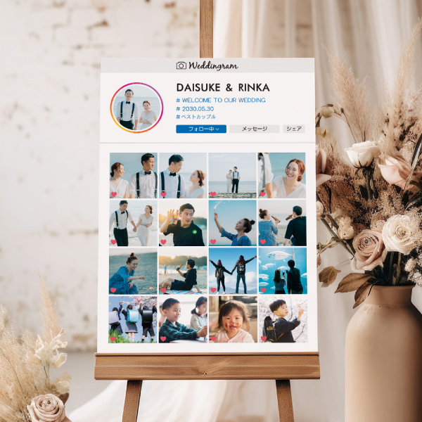 SNSを感じさせるデザインで、おふたりへの親しみがより感じられるウェルカムボード。幼い頃の写真やお気に入りの写真で作り上げます。