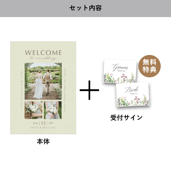 | 無料特典 | 受付サイン1組(新郎用×1組、新婦用×1組) |
